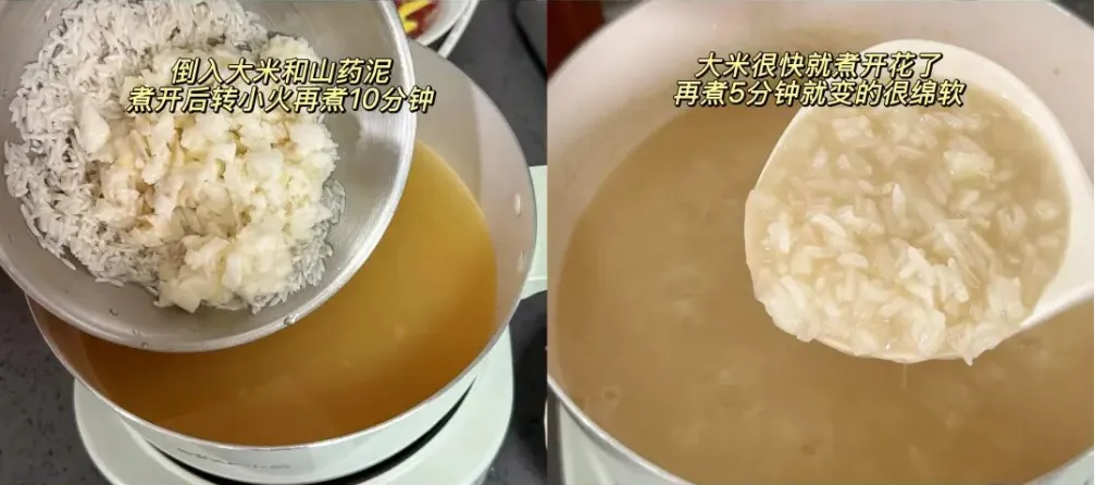 把山药泥,大米加进去虾汤里煲10分钟,山药泥很快就熟了,大米也煮开了花,再煮5分钟就变得很绵软了。