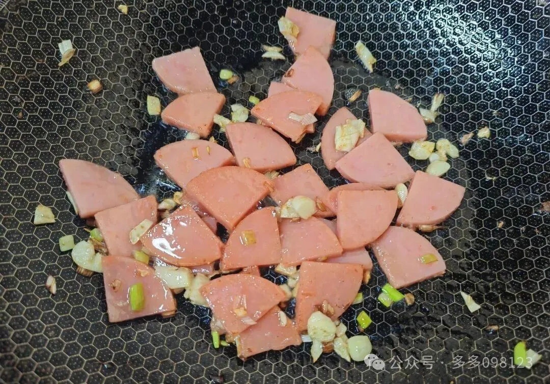 鸡蛋炒好盛起来 , 锅里再放点油炒香肠 , 这一步是关键 , 香肠要炒到微微焦黄 , 香味才能完全释放出来 , 然后下葱蒜爆香。
