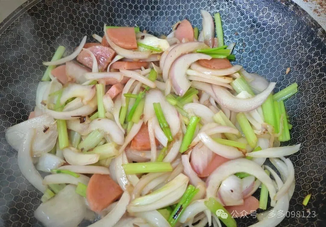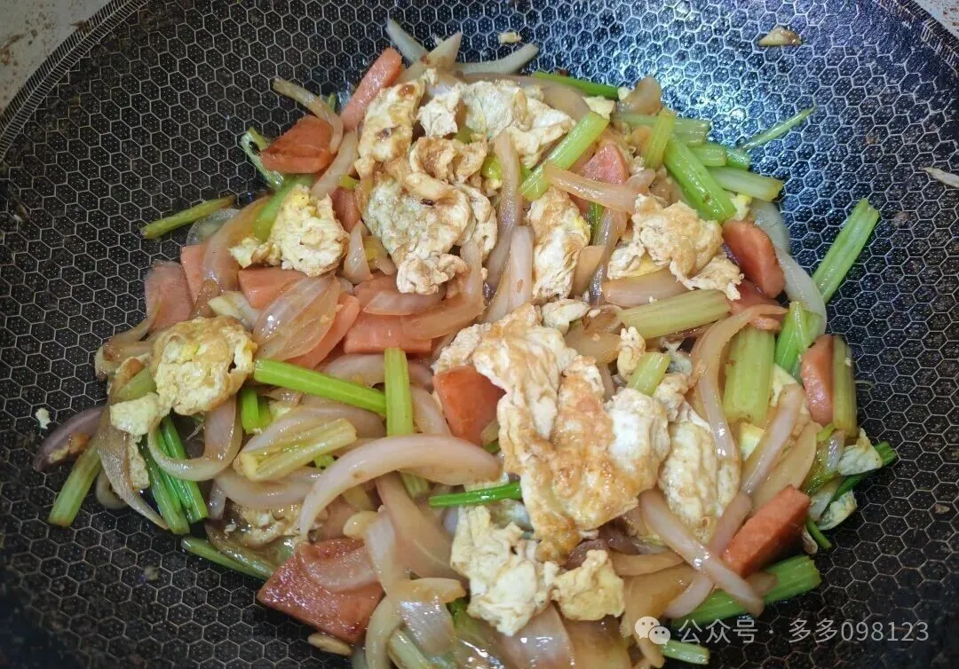 加个鸡蛋就更绝了 , 鸡蛋的嫩滑配上洋葱的甜脆 , 这组合简直了 , 再来点香肠提味 , 芹菜增加口感层次 , 完美!