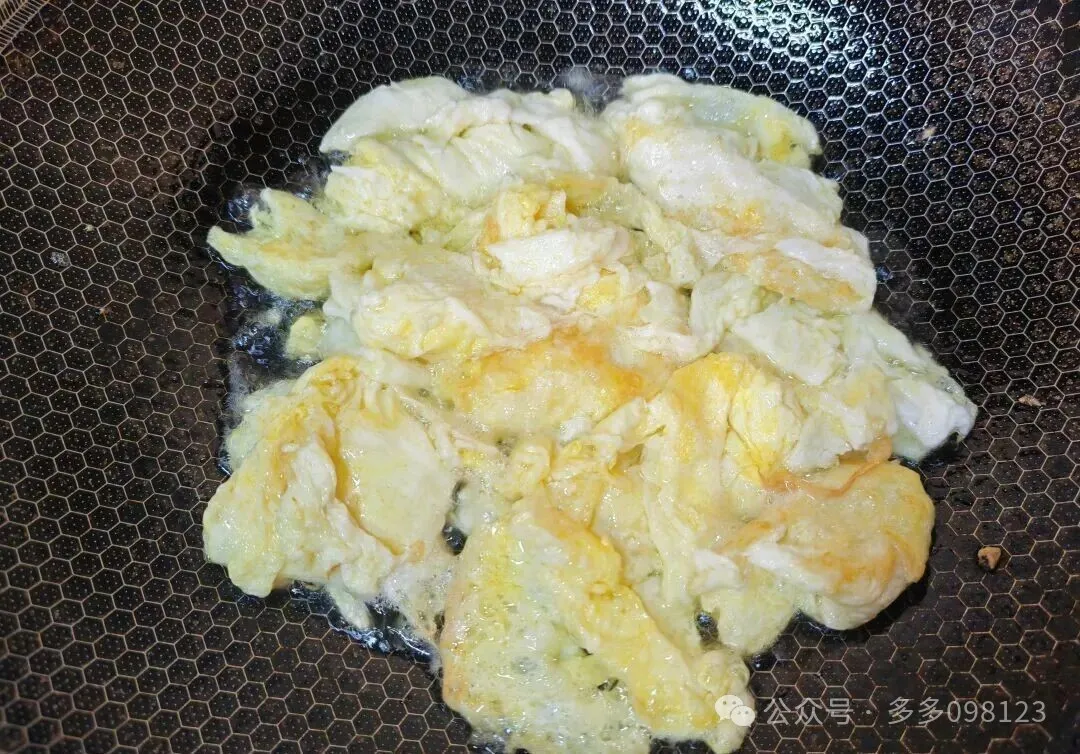 先炒鸡蛋 , 这个顺序很重要 , 热锅下油 , 油温上来就倒蛋液 , 别着急翻动 , 等它稍微定型了再搅散 , 这样炒出来的鸡蛋块大小刚好 , 口感也嫩。