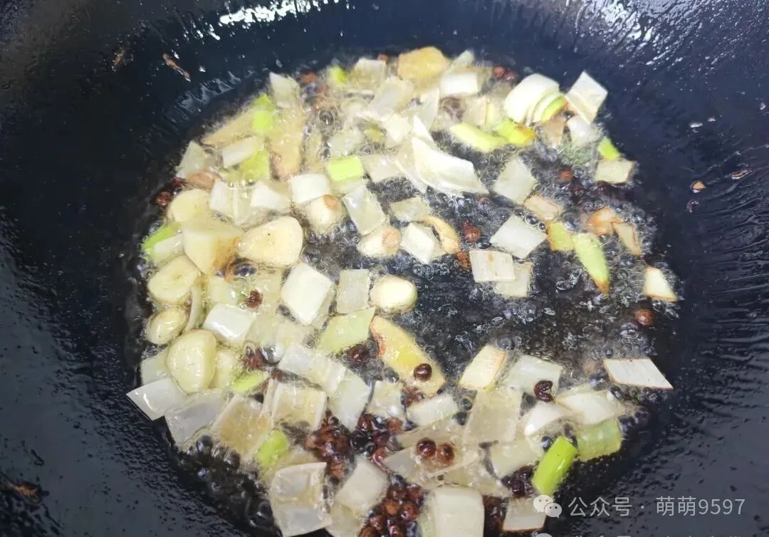 花椒的香气一出来 , 整个厨房都香了 , 不喜欢吃花椒的可以把花椒粒捞出来 , 只要香气就行 , 然后下葱姜蒜 , 炒出香味 , 这个步骤是整道菜的基础 , 香气不够 , 后面怎么做都不香!