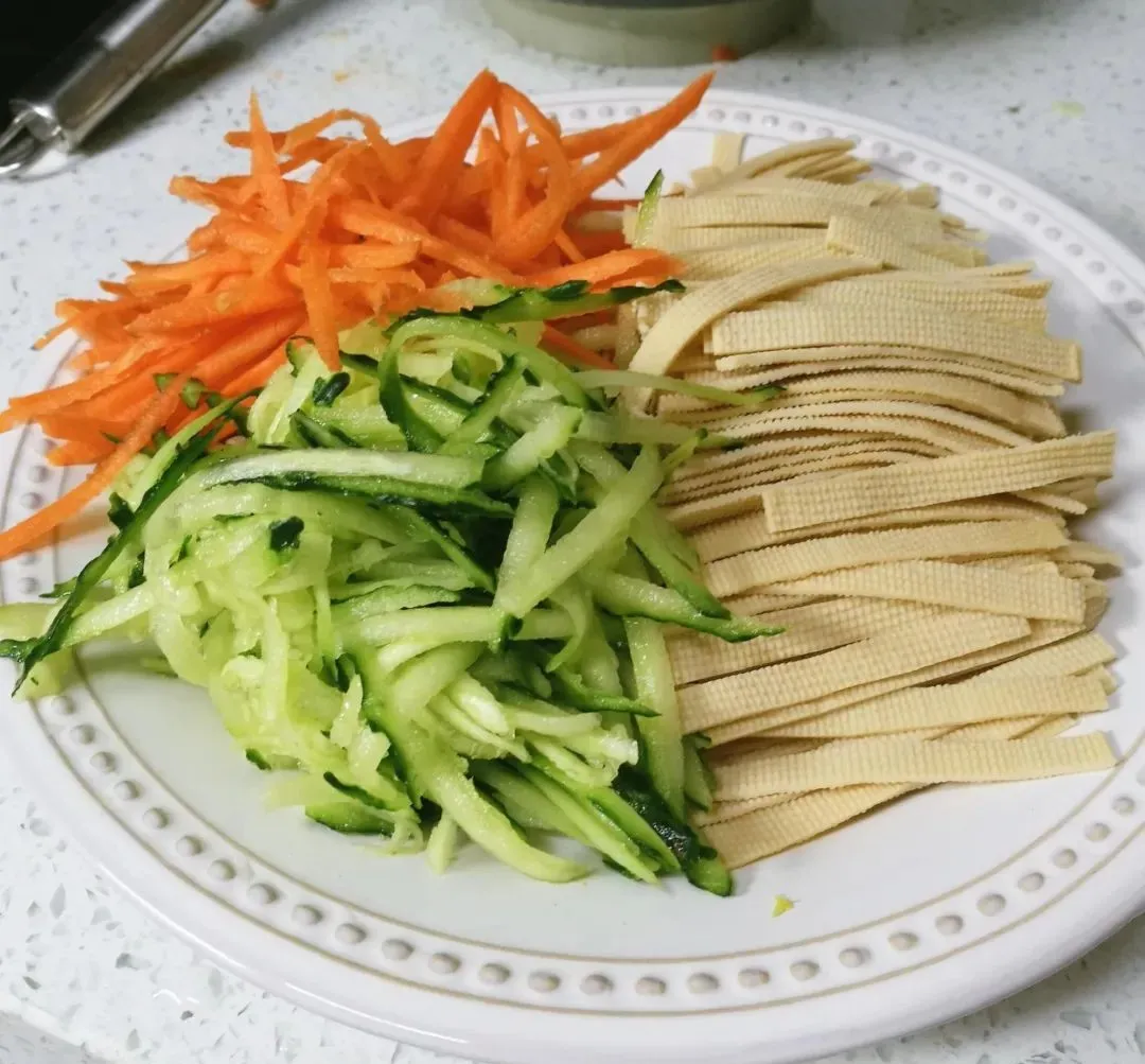 1、把豆腐皮切成丝,用擦丝器把黄瓜和胡萝卜擦成丝备用;