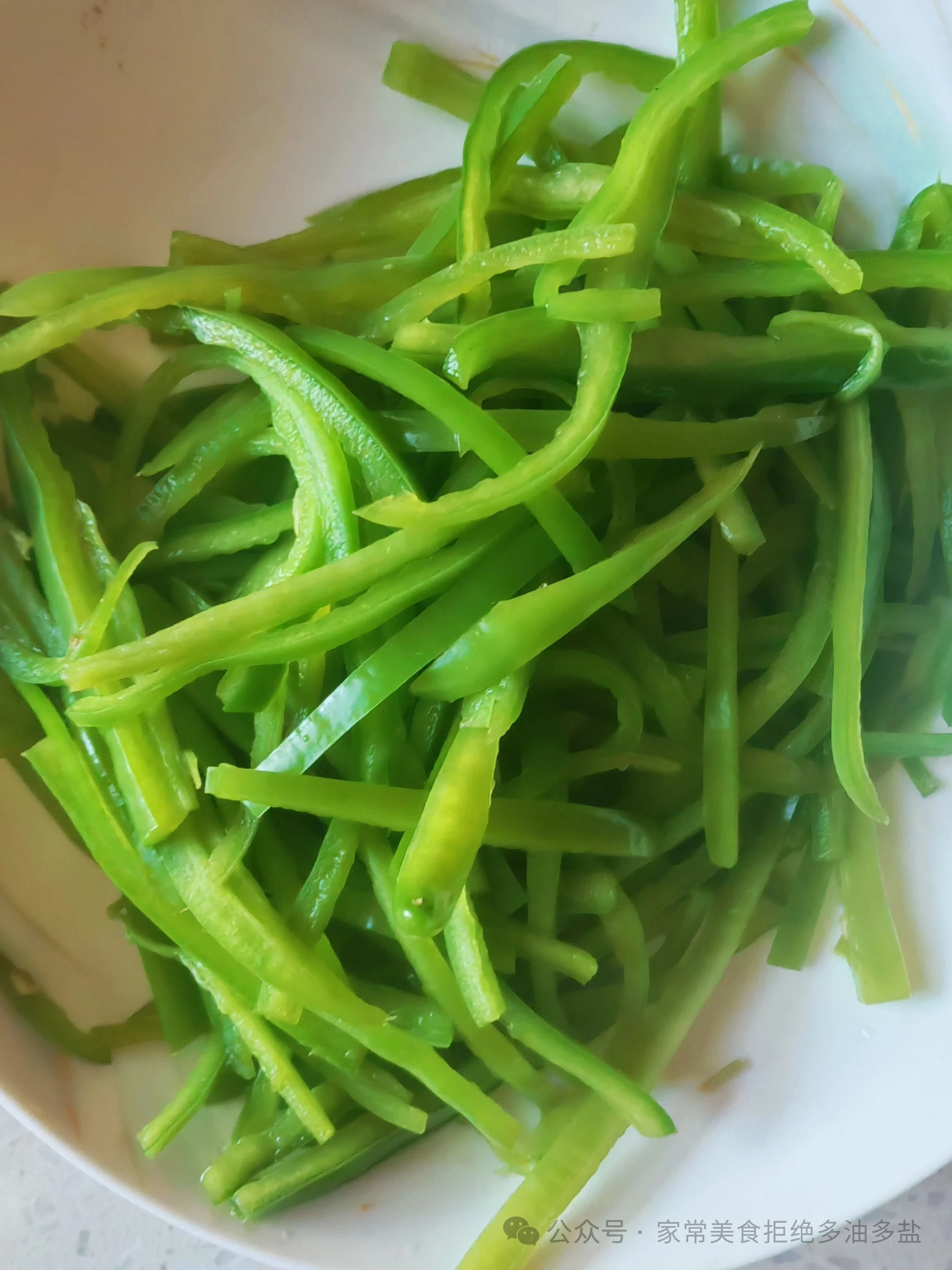 制作方法:将尖椒如图切开,挖掉辣椒种子,然后切成细丝备用,将猪肉洗干净冷冻到能切的时候不变形,这样切的丝均匀还切不到手,我一般买了猪肉以后,都会冷冻后切好丝再冷冻分几个袋子保存,每个袋子放一餐的量,吃的时候把肉丝提前解冻,解冻后加少许料酒和生抽腌制一会,没有料酒就倒一点喝的酒也行主要是起到去腥的作用,然后配料,拿个小碗,倒三勺生抽,老抽少半勺,鸡精少许,十三香少许,淀粉三勺,白糖一勺,加50克的水,大概就是火锅里面捞食材的那种大漏勺那么大的便宜,然后搅拌均匀备用,将辣椒丝在锅里翻炒至变软,盛出备用,然后锅里倒油,将肉丝倒入,翻炒到肉丝变色,倒入配好的料汁,继续小火翻炒,看到汤汁变少后加入炒软的辣椒丝,再翻炒30年,出锅就是美味的尖椒炒肉丝啦!