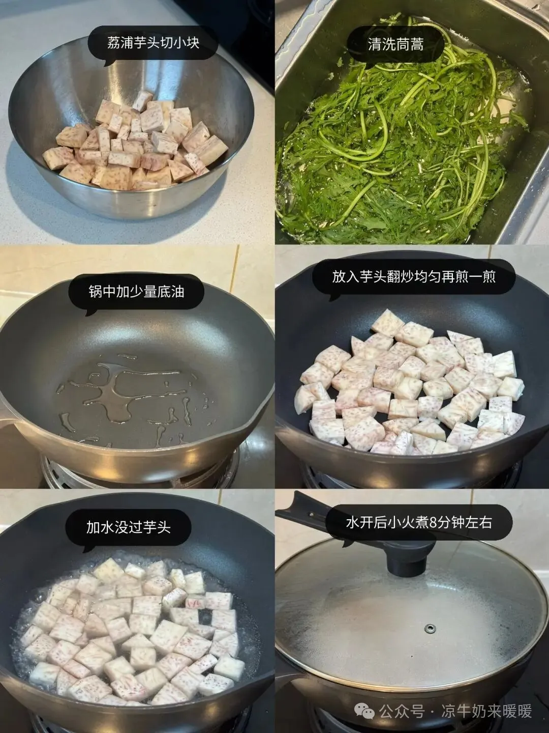 这季节的芋头最是软糯,茼蒿正是鲜嫩的时候,这两样加起来成本才5块钱,味道却一点不输大鱼大肉。