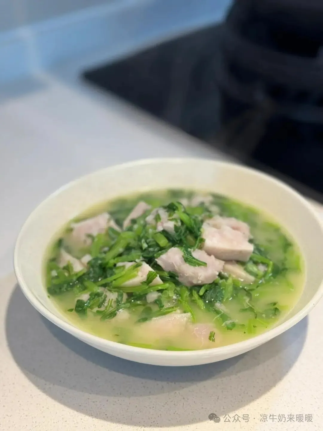 翠绿的茼蒿挂着奶白的浓汤,还有香香软软的芋头点缀其中。