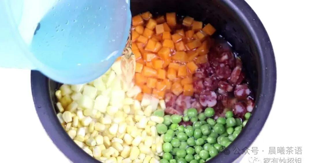 加水 , 比平时蒸饭稍微多一点点 , 因为蔬菜会吸水。 但也别加太多 , 不然就成泡饭了...