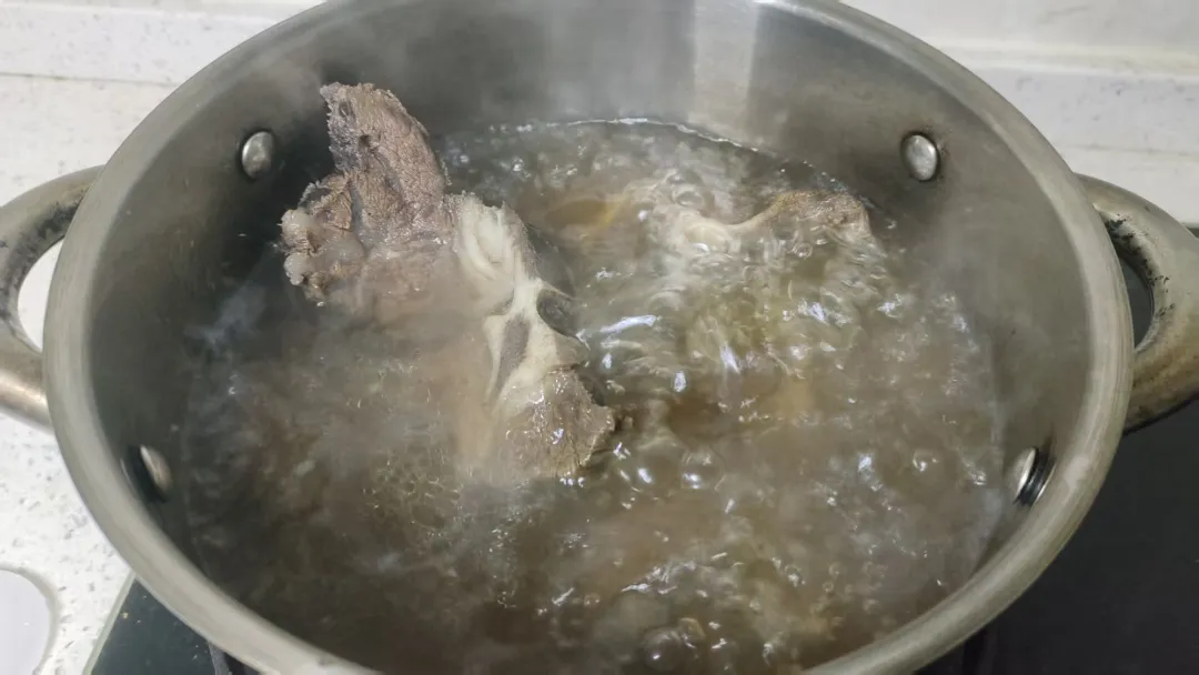 第一步:刚刚红烧牛汤骨的原汤盛一点到锅里,放进牛汤骨头。