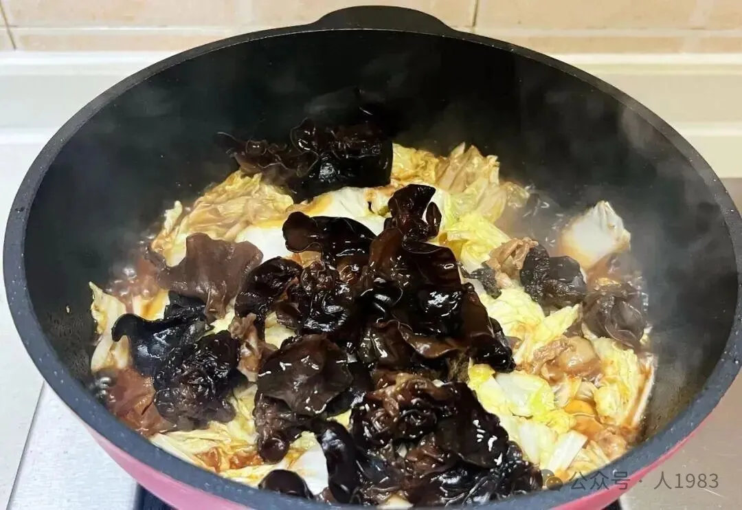 - 放入白菜翻炒,接着加入泡发好的木耳和粉条;