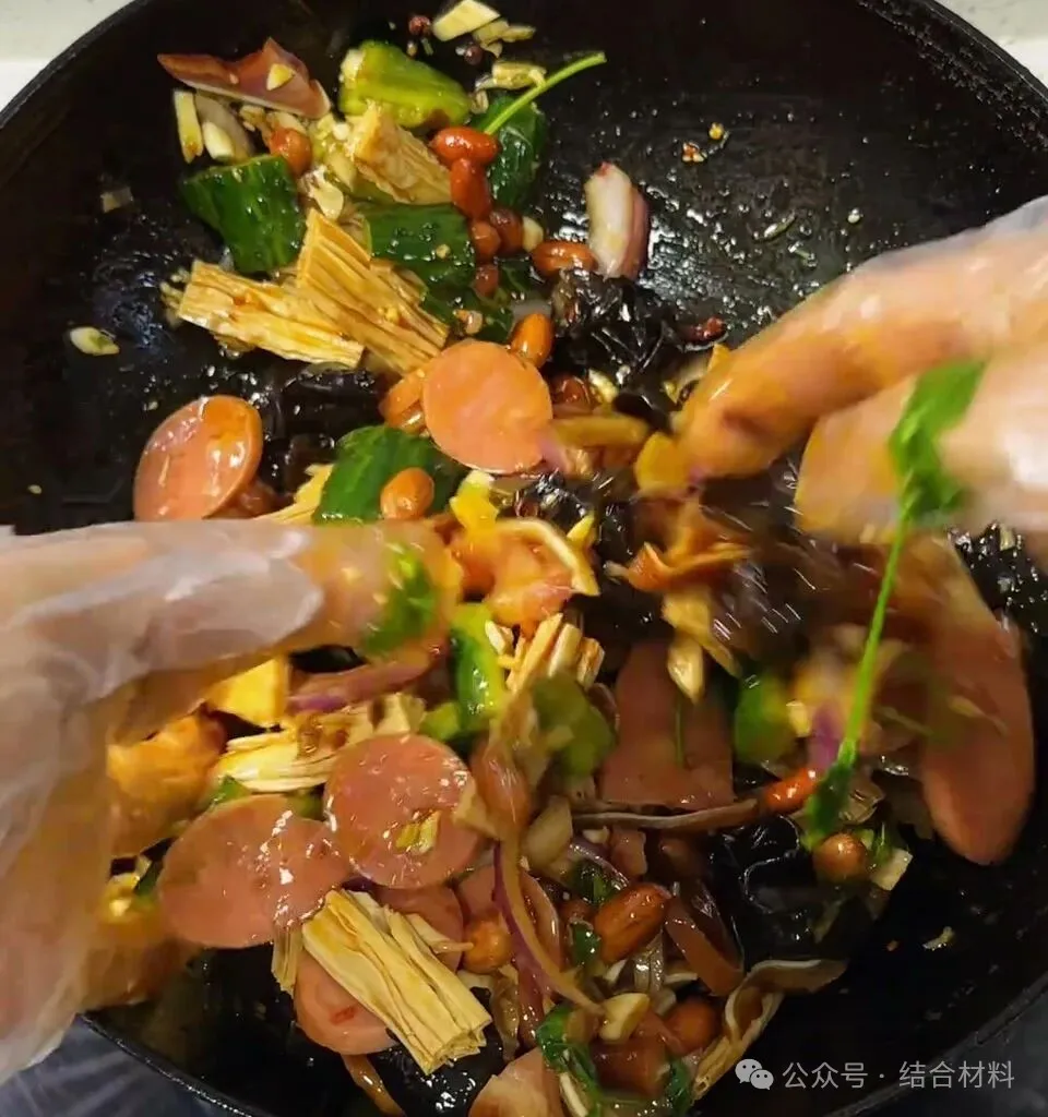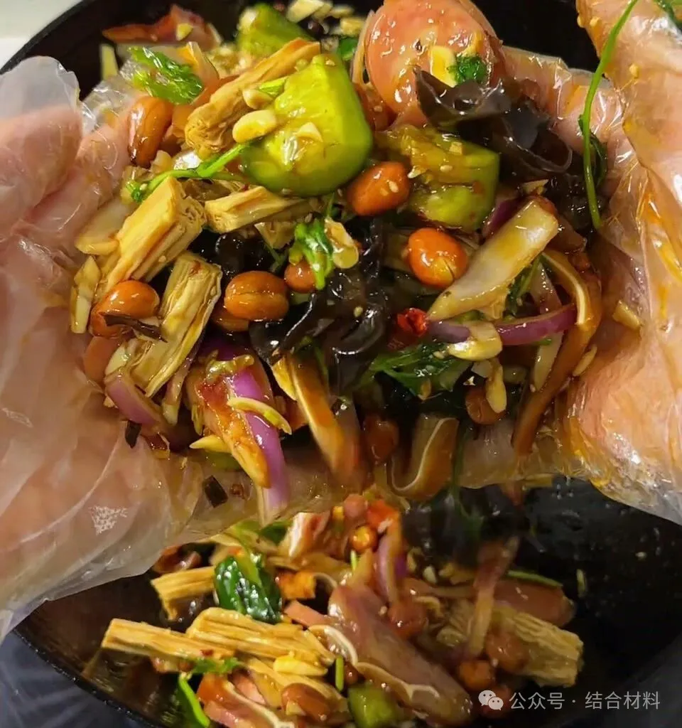 戴上一次.性手.套,把所.有食.材翻.拌均匀。手拌.最省事,每样.都能拌到.位。