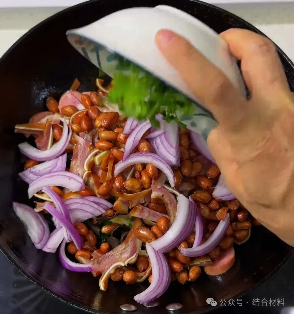 炸好的.花生米、紫洋.葱丝和.香菜全部.丢进去。洋葱丝.切细点,不会.太冲,还能.提香。