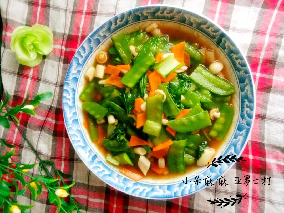 荷兰豆,白玉菇,小油菜,胡萝卜,姜末,植物油,素蠔油,盐,淀粉