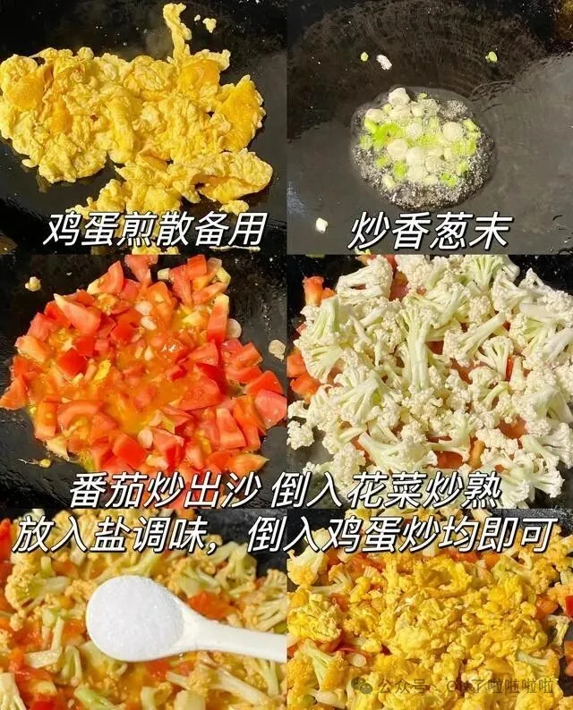 花菜掰成小朵 , 先焯水两分钟 , 捞出来沥干。 鸡蛋打散 , 锅里炒成碎块盛出。 然后花菜下锅 , 炒到微微焦 , 把鸡蛋倒回去 , 撒点盐 , 一勺生抽 , 翻匀。