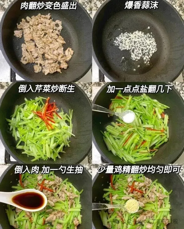 做法也简单到离谱。 肉丝用生抽、淀粉抓一下 , 芹菜斜刀切段 , 锅热油 , 肉丝滑散 , 倒芹菜 , 大火猛炒 , 断生就出锅。