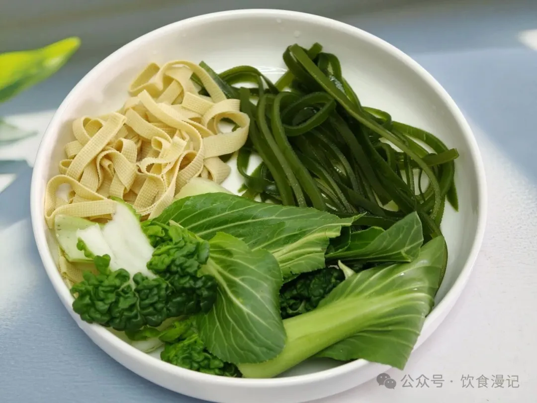 10、自己喜欢吃的各种配菜(通常有小青菜、豆腐皮、海带丝)清洗干净。