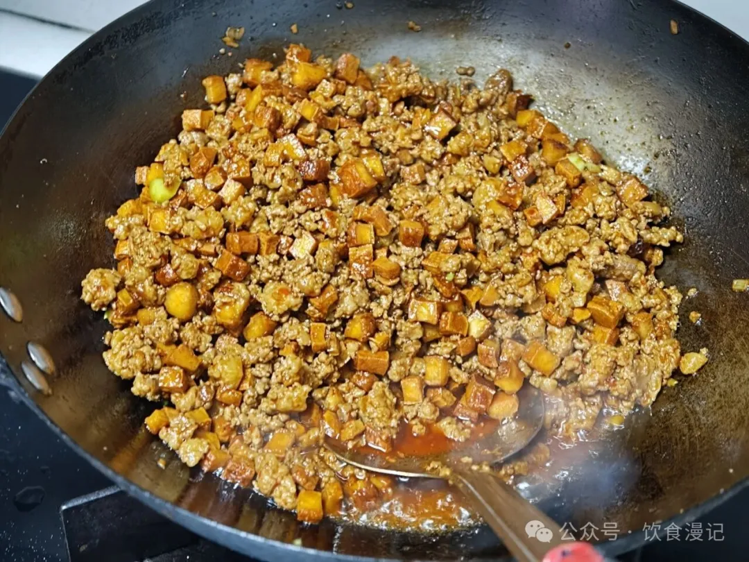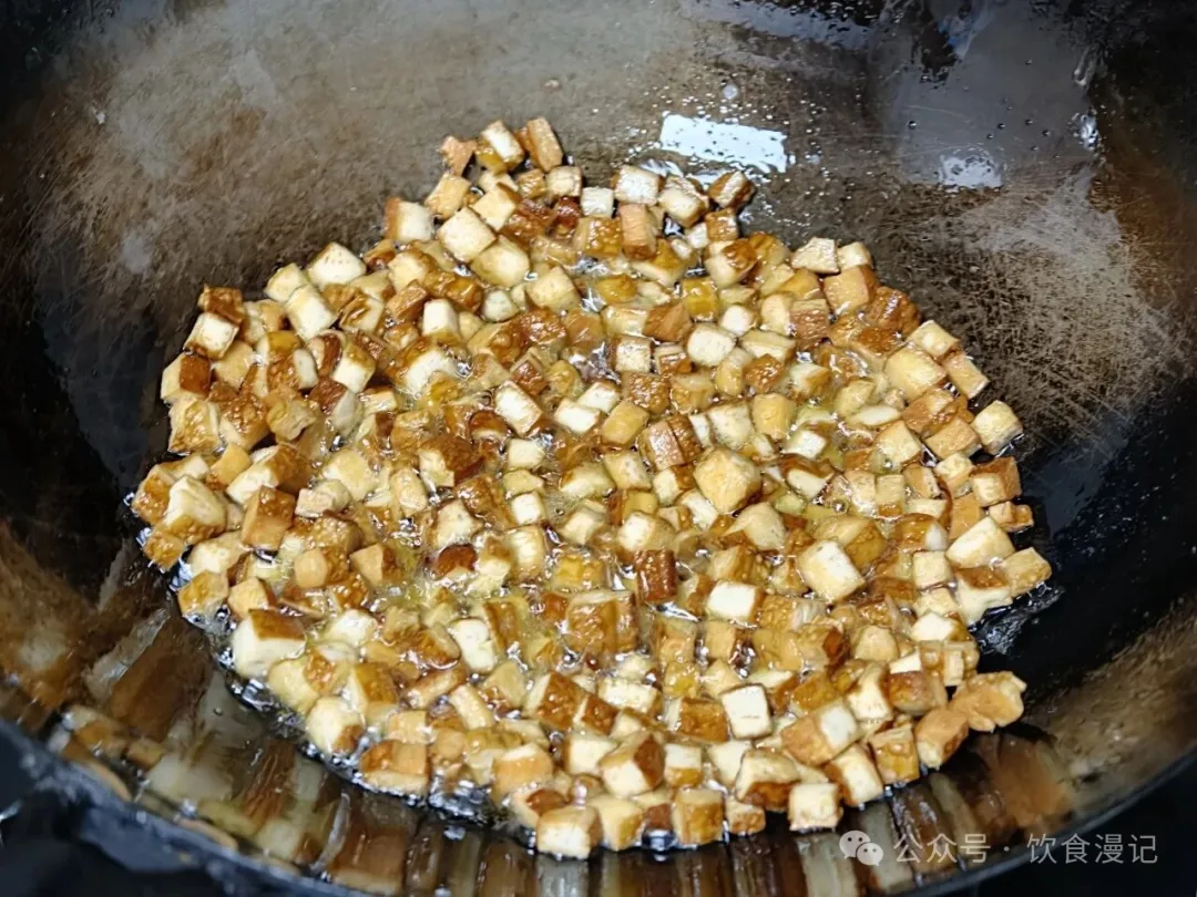 7、慢慢炒化后,再把煎好的豆干丁倒进去一起翻炒。