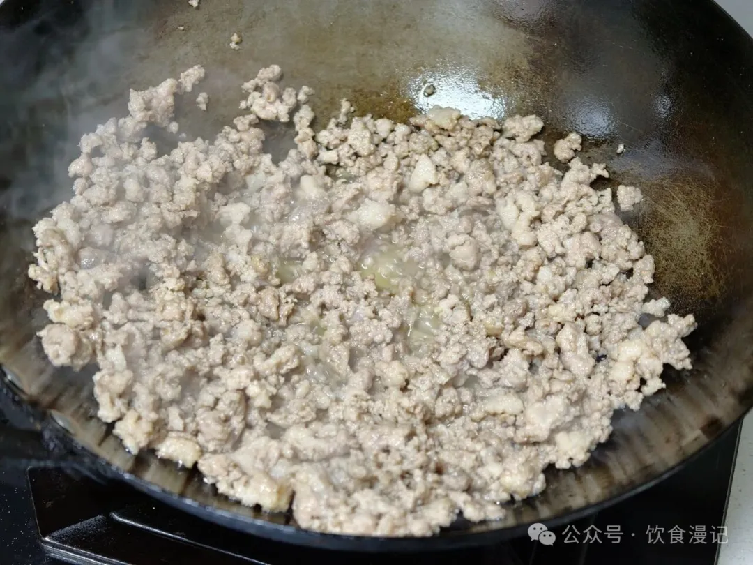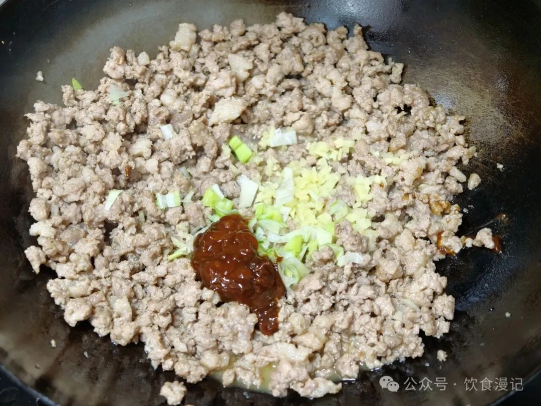 5、肉末里加入,葱末姜末、生抽老抽、料酒、白胡椒粉、黄豆酱炒干水分。