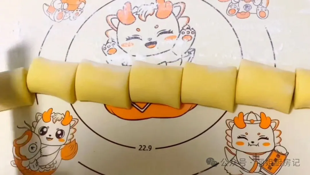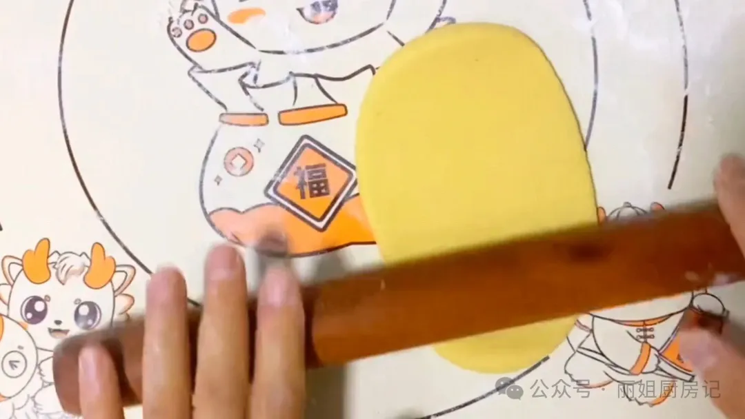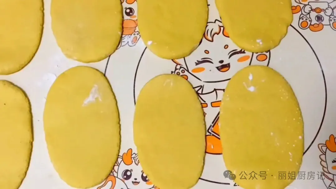 5.把剂子的切口处给它捏严,两边都要给它捏紧。然后,忌口朝上,两头向中间收拢,用虎口再把忌口给它收起来。每个剂子都这样做好,然后再给它团成圆形,放在面垫上稍微的整理一下,轻轻的擀薄,擀成一个椭圆形状。这样一个生胚就做好了。