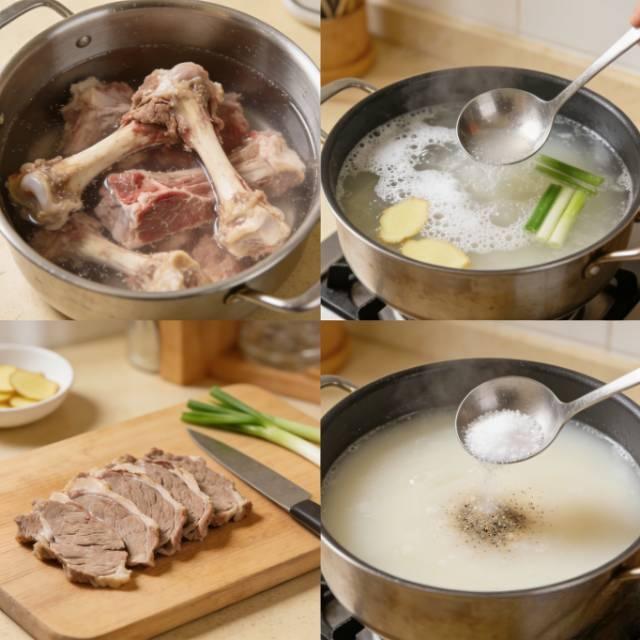 先熬制浓汤,把羊骨和羊肉用清水泡一泡去血水,冷水下锅煮开,撇掉浮在上面的白沫,再加入姜片、葱段,换一锅清水用小火慢慢熬煮 3 小时,熬到汤汁变得奶白奶白的,捞出羊肉切片,浓汤里加少许盐和白胡椒粉调味。