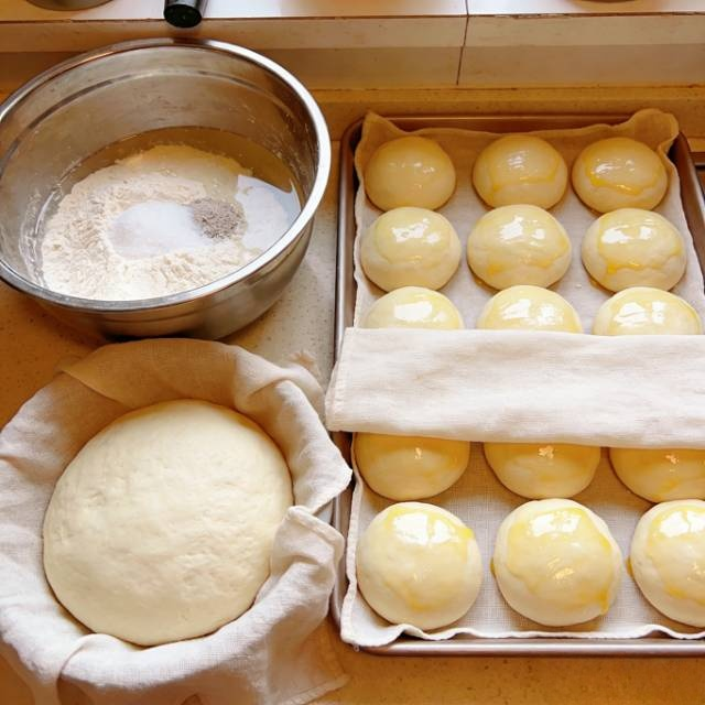 再来和烩面的面团,把面粉、少许盐和一点点食用碱混合,加入温水揉成光滑的硬面团,盖上湿布醒 30 分钟,醒好后再揉一揉,分成小剂子,每个剂子刷上一层油,再醒 1 个小时,这样面团才能拉得又长又宽。
