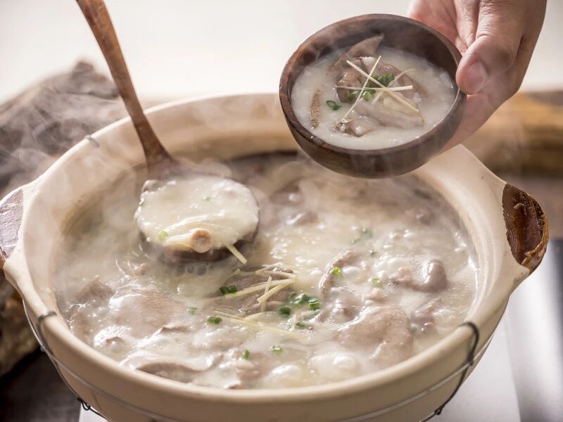 广州人食粥讲究四时食补,菜干、猪杂、皮蛋、肉类、海鲜,甚至水蛇、田鸡……都可入粥,从而补充水分和各种营养物质,有养生保健的功效。