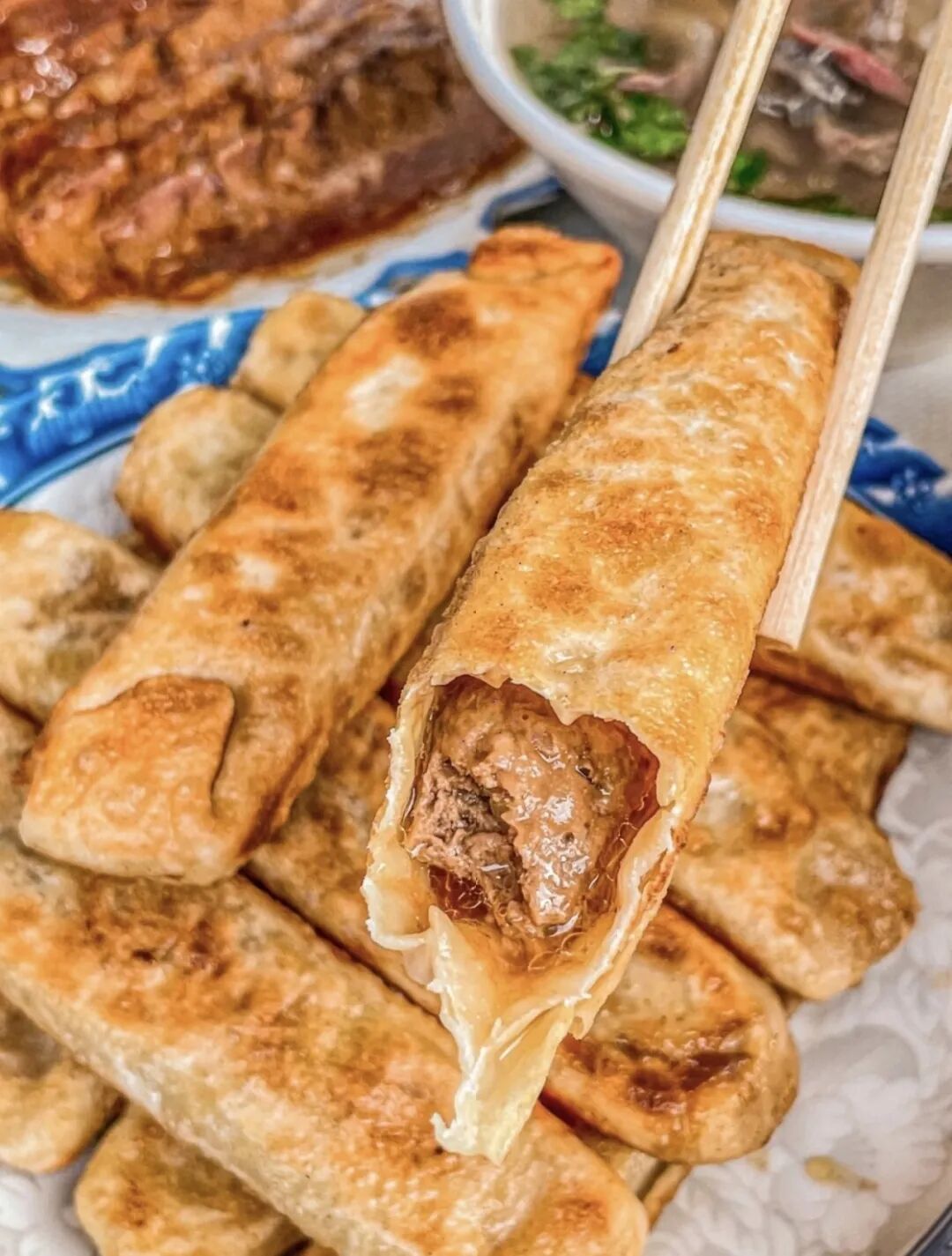形如金黄月牙,外皮煎得酥脆焦香,内里是扎扎实实的饱满肉馅。