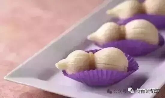 制作:先将鹰栗粉100克、糯米粉400克、水1000克和好后,放蒸箱蒸制20分钟,蒸好后取出放一旁凉后待用。再将奶油500克、苹果300克、菠萝300克制作成馅。取米兹皮35克包6克奶油馅,撒少许抹茶粉即可。