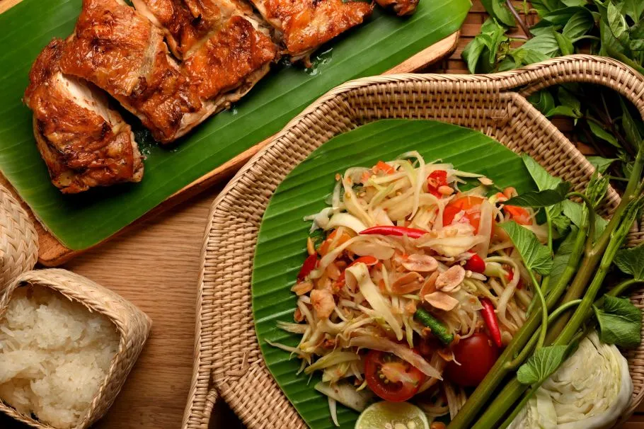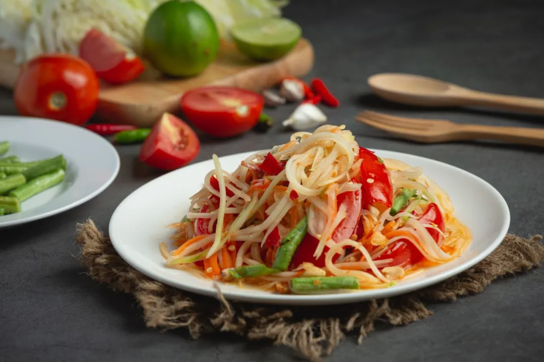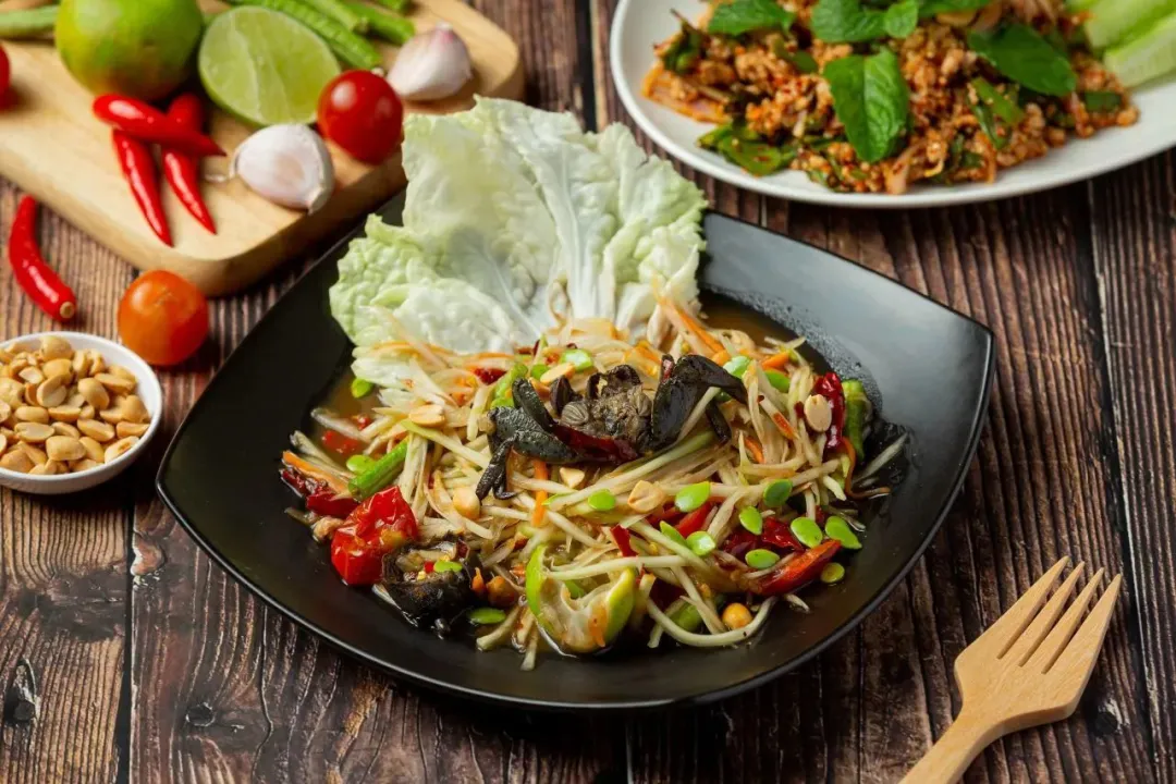 青木瓜沙拉是泰国东北部的一种小吃,在泰国当地乃至世界范围内都很受欢迎。具有醇厚、酸、甜、咸、辣的特点,在2023年世界最佳沙拉菜单中排名第六。其主要原料有青木瓜,小番茄、苦茄子,辣椒、豇豆、大蒜,并用棕榈糖、鱼露和青柠檬调味。