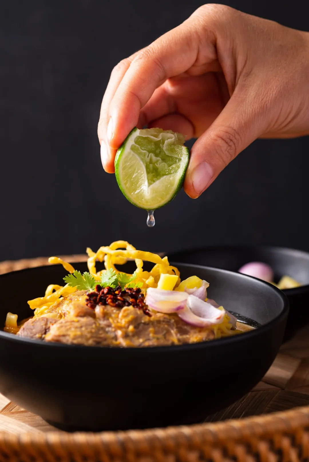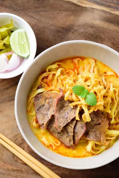泰北咖喱面是一道来自泰国北部的独特美食。曾在2022年 Tasteatlas 网站“50 份最佳汤品”中排名第一。其美味源于以椰奶为原料熬制而成的汤底,再配合咖喱酱的辣味与面条融合。除此之外,还有鸡肉、牛肉或猪肉,脆皮炒面及腌芥菜、葱段、油炒辣椒、酸橙等作为配菜。