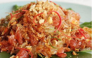 柚子沙拉是泰式沙拉的一种,具有甜、酸、咸、辣多种层次的味道,普遍作为开胃菜,味美多汁。