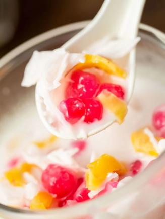 脆爽的如红宝石般的原料浮在椰奶中,多彩鲜艳。口感外皮柔韧,内馅爽脆,由荸荠粒和食用色素混合在一起制成。煮熟后,加上碎冰,与椰奶或冰淇淋搭配,清凉爽口,香甜无比。