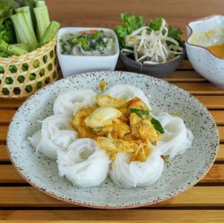 泰南螃蟹米线是泰国南部地区的美味。深黄色咖喱酱含有椰汁的香味,再加上大块的新鲜蟹肉,各种配菜,以及有嚼劲的米粉,味道完美的融合在一起。