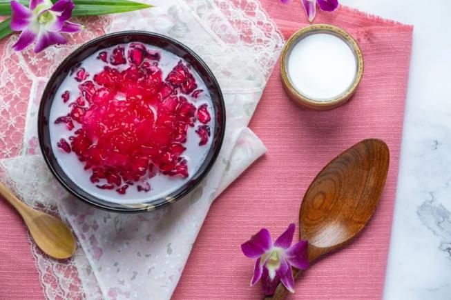 椰浆红宝石是一款美味的传统泰式甜品,制作过程较为复杂,曾被美国CNNGo网站评为位列前50名的甜品。