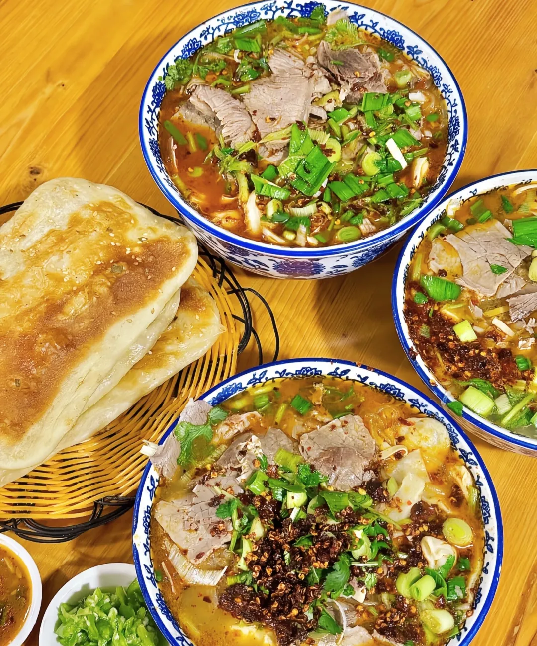 用江淮黄牛骨加20味香料熬6小时,汤白味浓,配粉丝、牛肉片和油酥烧饼,全国门店超万家。