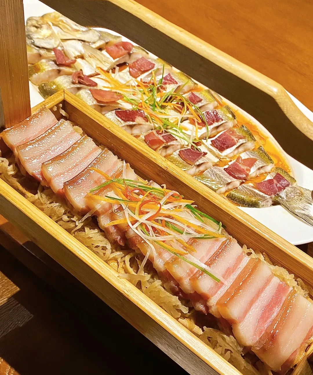 皖南腊味,黑猪肋排盐渍后风干,蒸制时放香樟木板上,肥肉晶莹,瘦肉咸鲜带木质香。