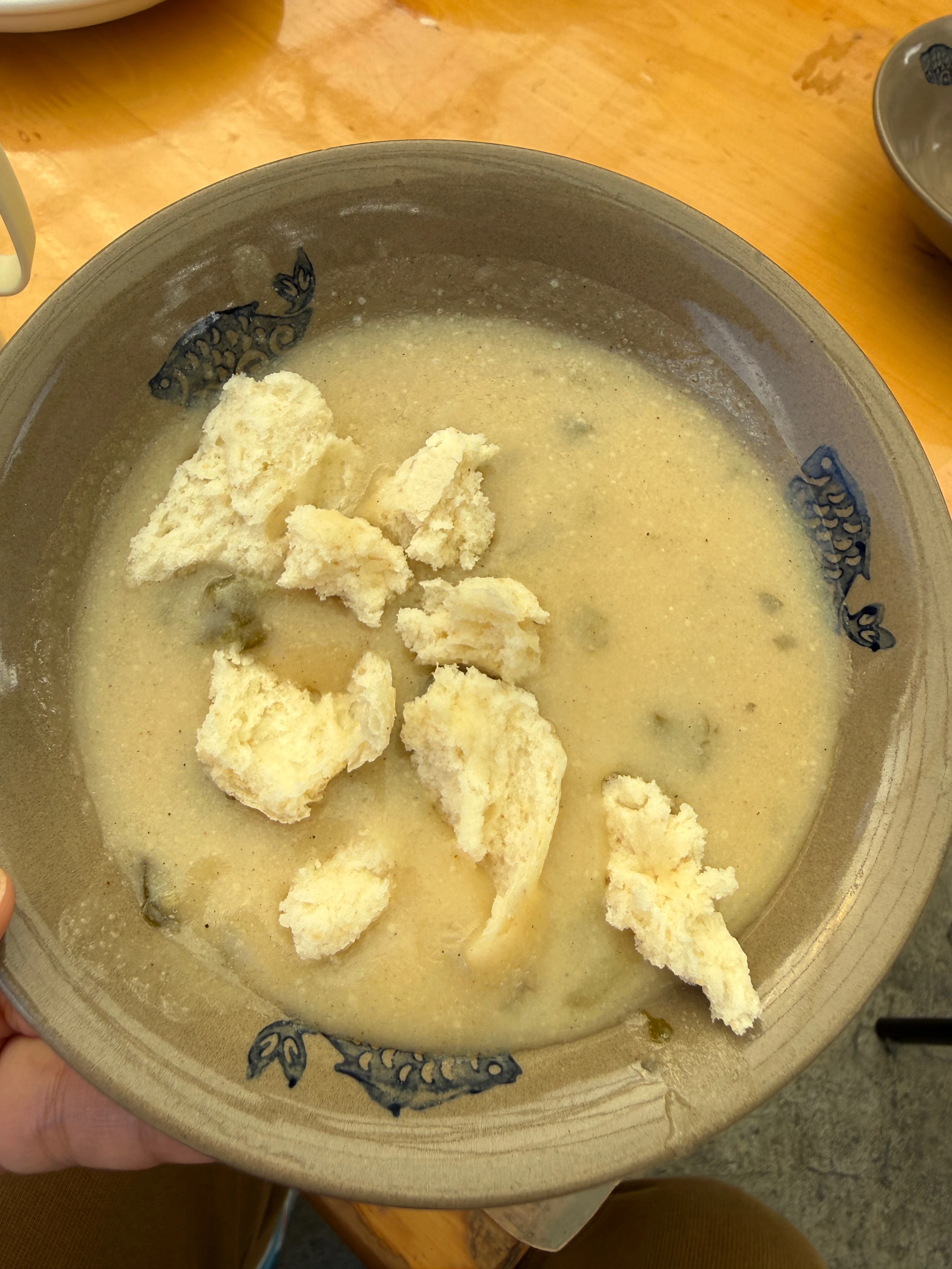 4️⃣豌豆汤配锅魁,是金川农家菜的“灵魂CP”。豌豆汤用新鲜豌豆熬煮至绵密,汤色碧绿如翡翠,清甜暖胃;锅魁则是现烤的,外皮酥脆掉渣,内里松软如云,蘸着豌豆汤吃,酥与软、咸与甜在口中碰撞,简单却让人停不下筷子。