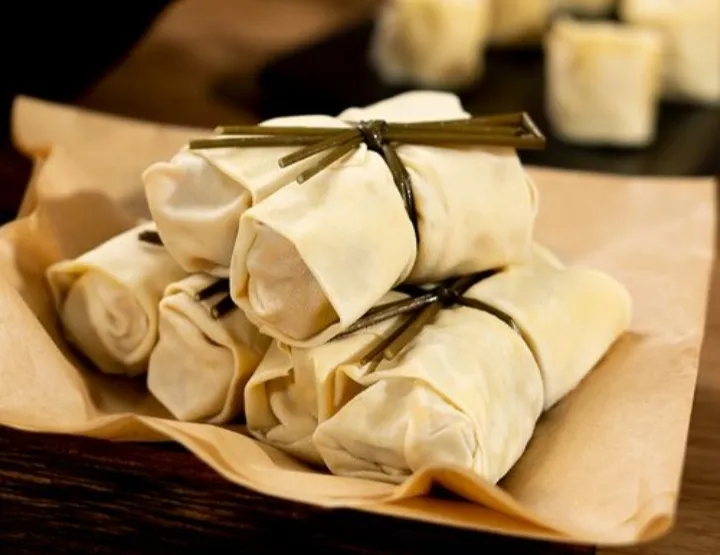 湖州千张包以其“薄如蝉翼的豆皮裹鲜”的独特风味闻名,是江南饮食文化中的经典代表。其外皮选用优质黄豆制成,薄透柔韧,阳光下泛着淡淡光泽,入口轻柔带豆香,既不掩盖馅料本味,又与内里交融出层次感。馅料以鲜猪肉为主,搭配脆爽笋丁、鲜甜虾仁或软糯香菇,肥瘦相间的肉质保留颗粒感,咀嚼时肉香、笋鲜、虾甜交织,汁水随咀嚼缓缓渗出,浸润味蕾。