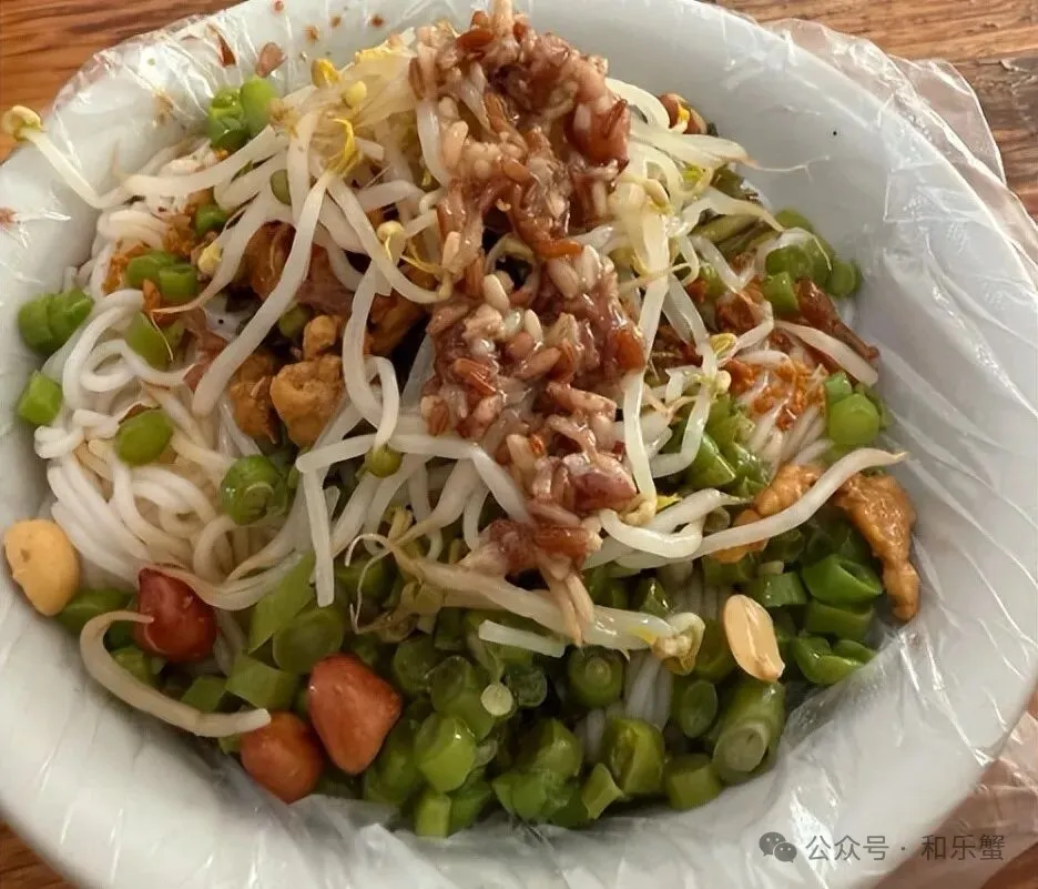 长坡米线:米线滑嫩有弹性,食用时搭配牛肉干、花生粉、炸虾米等“大料”,以及蒜茸油、葱花等“小料”拌匀,软滑中带酥脆,香气浓郁。吃至一半加入半勺酒糟,香味更浓。