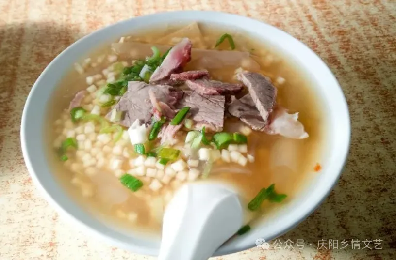 面丁下锅煮五分钟浮起,与配菜一同在高汤中翻滚,加盐和胡椒粉调味,撒上香菜末即可。入口面丁筋道,牛肉软烂,豆腐嫩滑,粉条软糯,蛋丝增添了口感的层次,高汤的鲜香包裹着每一种食材,温暖而扎实。这道硬菜是张掖人的早餐首选,也是招待客人的特色美食,一碗下肚,饱腹感十足,带着河西走廊的干爽与实在,唤醒一天的活力。