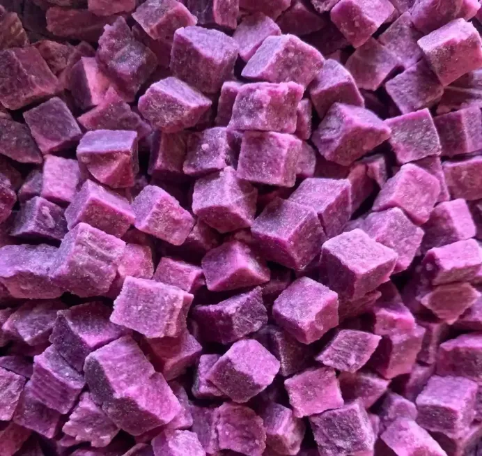 速冻紫薯的加工,始于对原料的严格筛选。只有表皮光滑、无破损、肉质饱满的新鲜紫薯,才能进入加工环节。首先,工人会将紫薯进行彻底清洗,去除表面的泥沙与杂质;随后经过去皮、切块处理,根据市场需求切成滚刀块、长条或丁状,确保大小均匀,便于后续受热;紧接着,切好的紫薯会进入漂烫环节,通过短时间的高温处理,既能杀灭表面微生物、延缓氧化,又能锁住紫薯中的淀粉与维生素,避免营养流失;漂烫后的紫薯会迅速降温,再进入速冻隧道,以-30℃以下的低温快速冻结,让紫薯内部水分瞬间形成细小冰晶,最大程度保留其原有的口感与营养,避免细胞破裂导致的口感软烂;最后,经快速称重、密封包装,速冻紫薯便完成加工,等待运往各地。