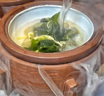 4.“冲浪”上桌:海参、裙带菜、枸杞放入深碗中,立即冲入滚烫的高汤,滴几滴香油即可。