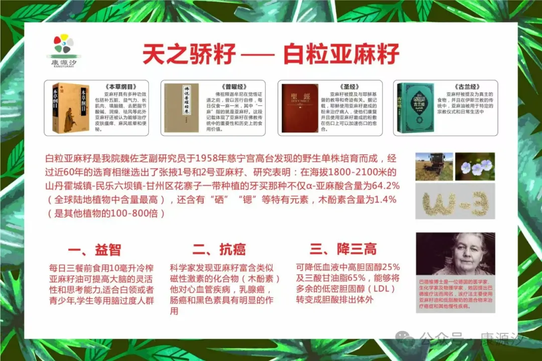 如果把普通的亚麻籽称为“一颗神奇的种子”,那白粒亚麻籽更被行业专家赞为“天之骄籽”。请看甘肃张掖农科院的定性:白粒亚麻到底有怎样强大的能量呢 ?餐饮食材网了解到亚麻籽之所以被誉为“天之骄籽”,因为白粒亚麻籽比普通亚麻籽产量高、α-亚麻酸含量更高,同时在高膳食纤维含量,以及Ω-3不饱和脂肪酸和亚麻木酚素的含量上也更高。