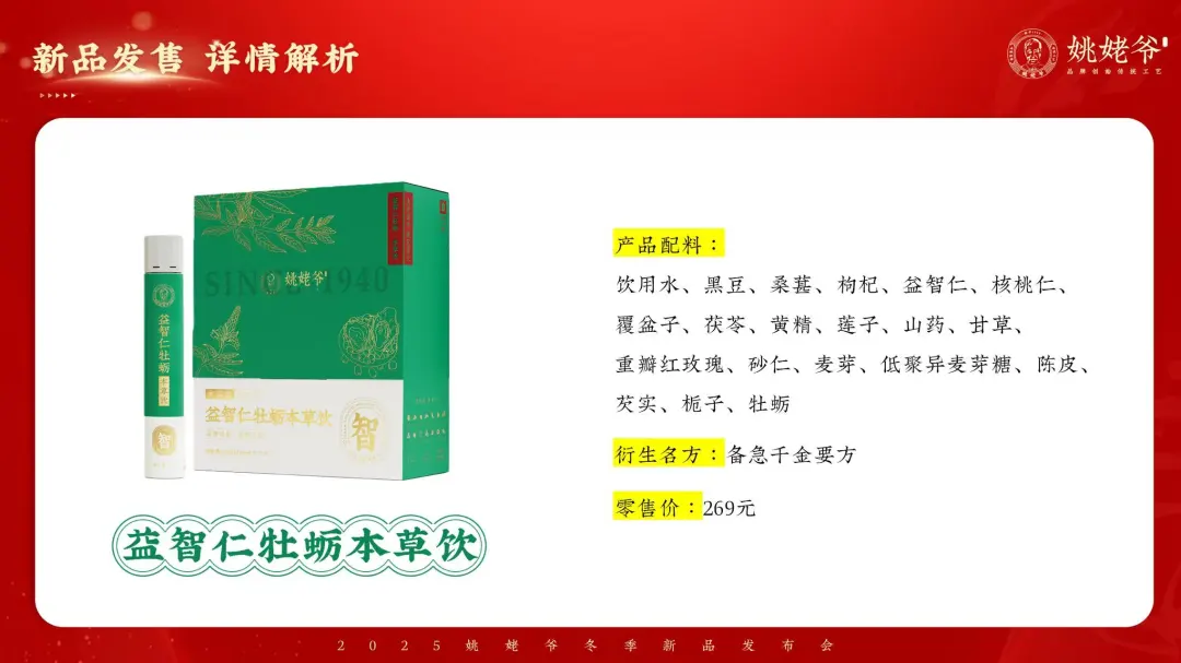 所以呢,在我们的这款益智仁牡蛎本草饮里面,加入了肾益精、填髓健脑的益智仁黄精、桑葚、枸杞、黑豆、核桃仁