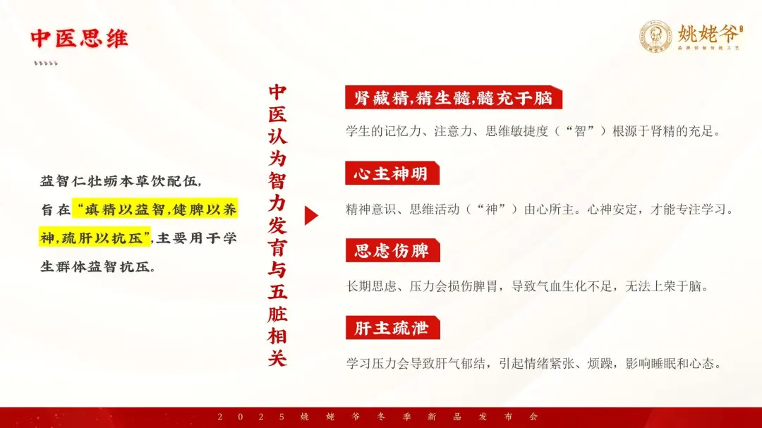 所以我们这款益智仁牡蛎本草饮,他从记忆力、远大的志向、专注力、抗压能力四个维度来形成组方