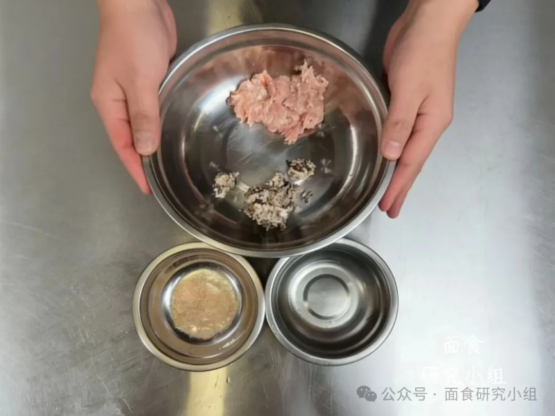 制作肉馅需要用到三种调料:葱姜水、葱油和调味粉。