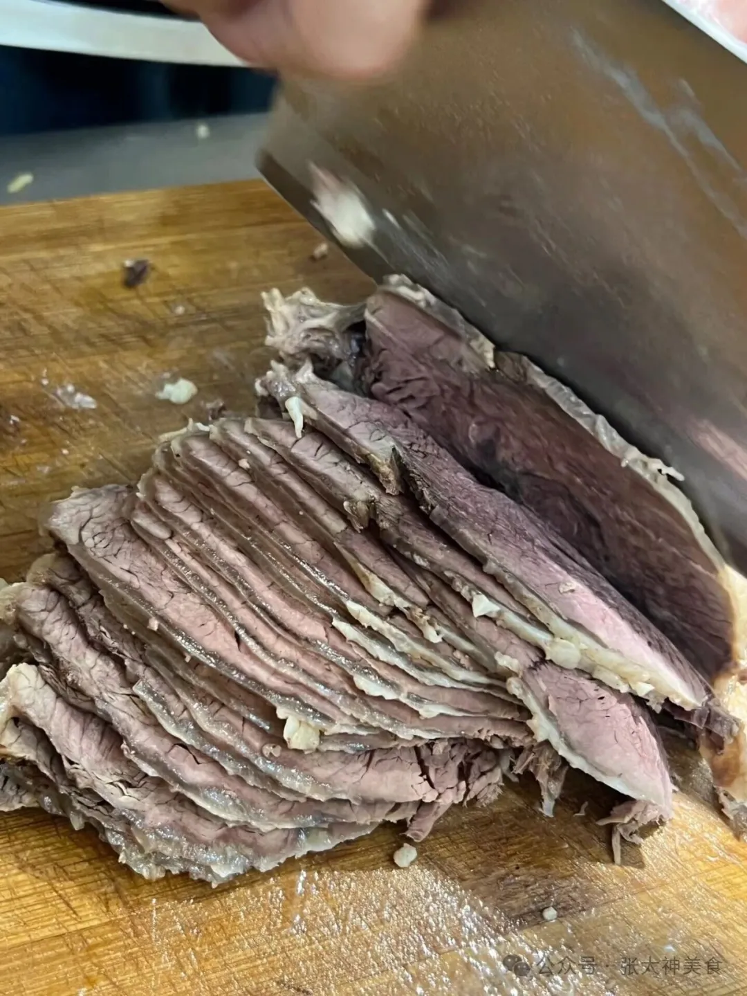✅ 逆着纤维切,厚度2-3mm,带筋部位切更薄,卖相好,口感佳。