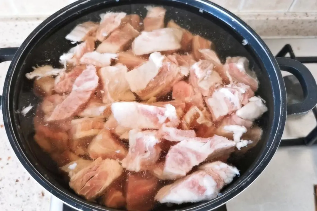 2、牛肉凉水下锅,放入大葱、姜片、料酒,锅开撇除浮沫,大火沸腾5分钟左右,捞出清洗干净,控干多余的水分。