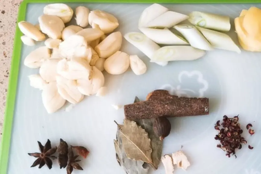 3、开始准备大料,香叶3片,八角3个,桂皮1块,花椒20粒,草果1个,大蒜1头,大葱1根,生姜3片,红茶一小撮,干山楂5片。