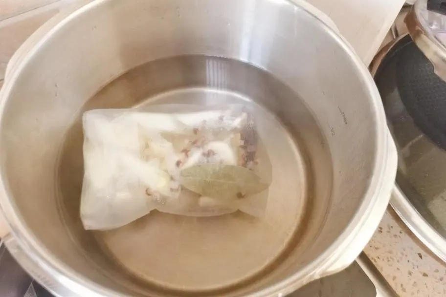 4、将所有的香料装进滤袋中,再准备一个高压锅, 将滤袋放入锅中,先浸泡一会儿。