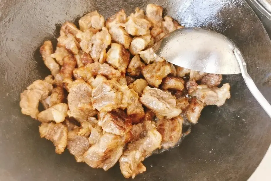 5、锅内少来点油,放入冰箱,中小火煸炒出糖色,倒入控干水的牛肉,继续煸炒一会儿,直到裹满糖色,变得焦黄为止。