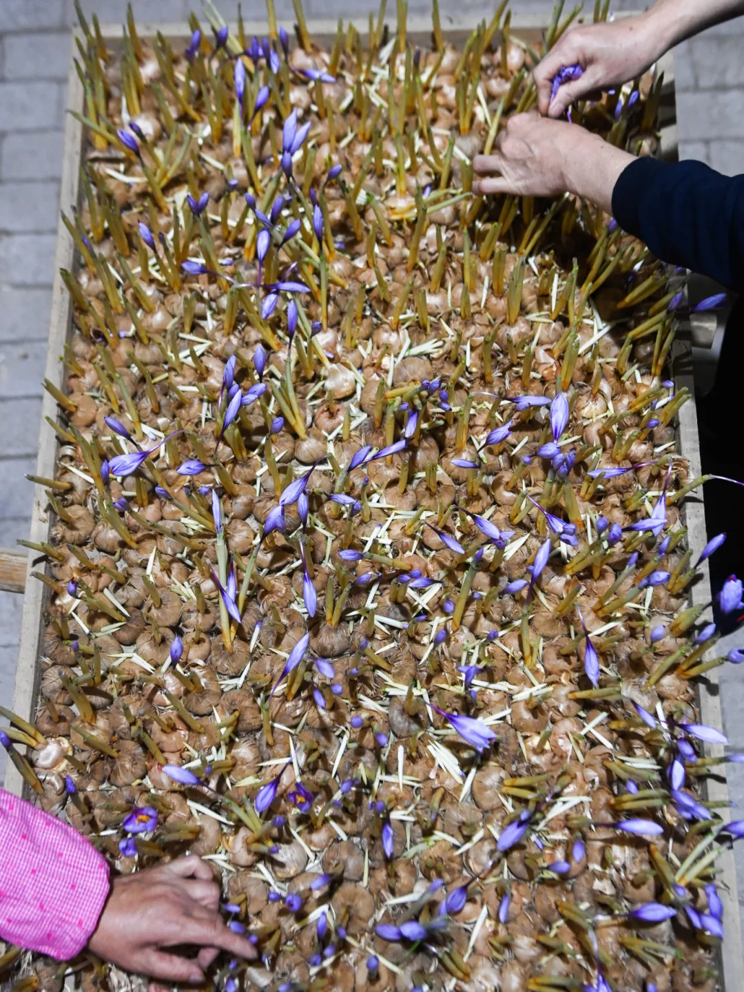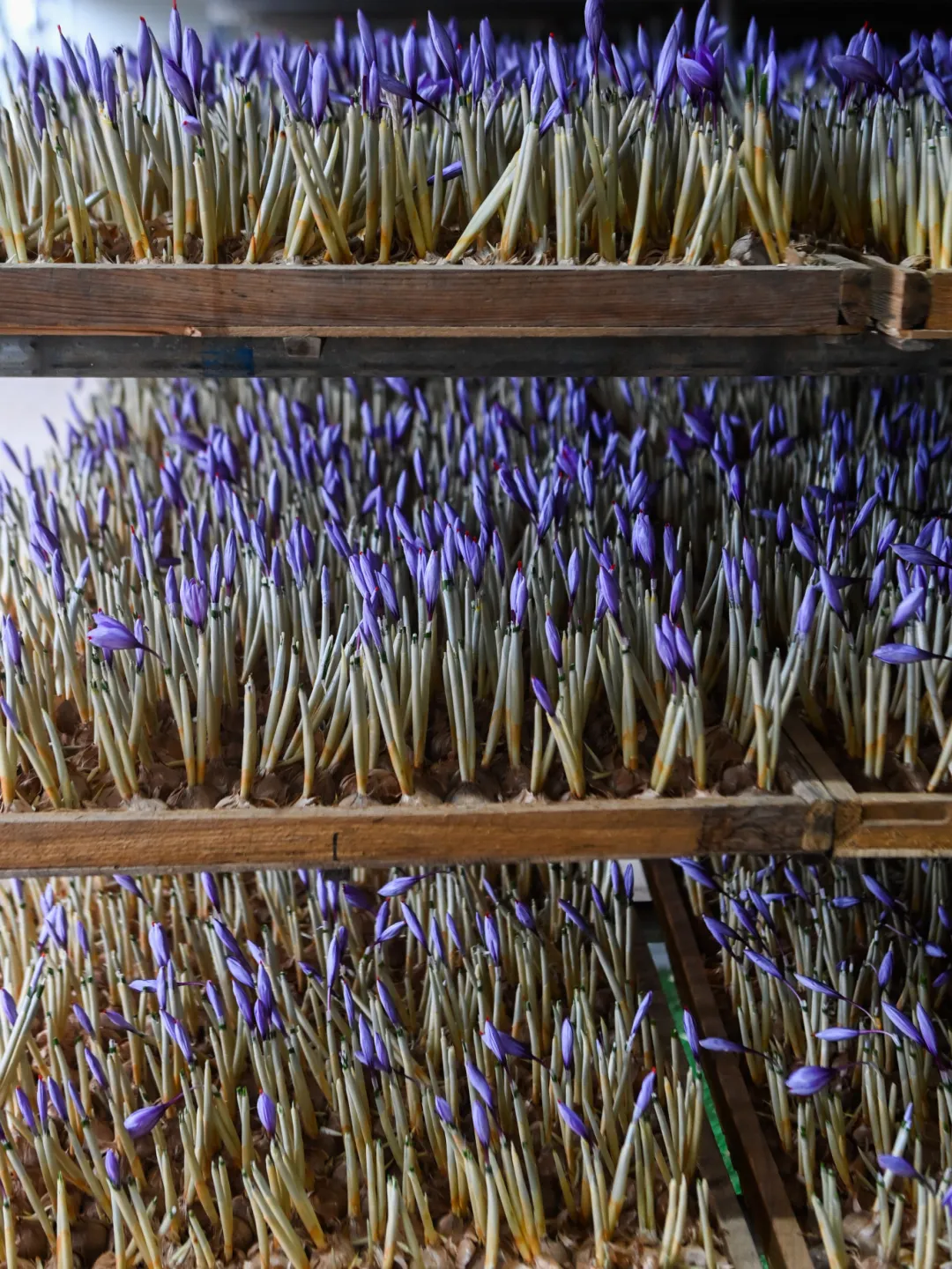 培育架上形似大蒜的西红花种球整齐排列,